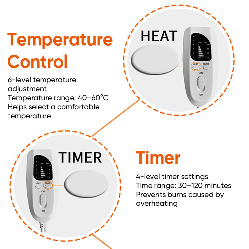 Temperature: Equipped with 6-level adjustable heating, the heating pad allows you to easily choose your preferred warmth between 40°C and 60°C. From gentle warmth to deep heat, it helps you find the most comfortable temperature for soothing relief.